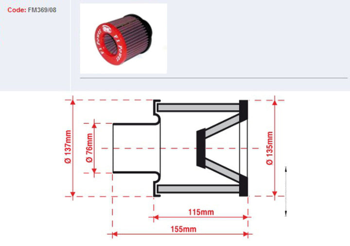 BMC konični zračni filter obično se naziva "zamjenski filter zraka". Instaliran je u originalnom zračnom okviru vozila za zamjenu OEM filtra zraka. Izrađen je od visoko izvedbenih materijala koji nema povećanog protoka zraka u kombinaciji s učinkovitijom filtracijom, jamčeći zadržavanje svih nečistoća od čak 7 mikrona.