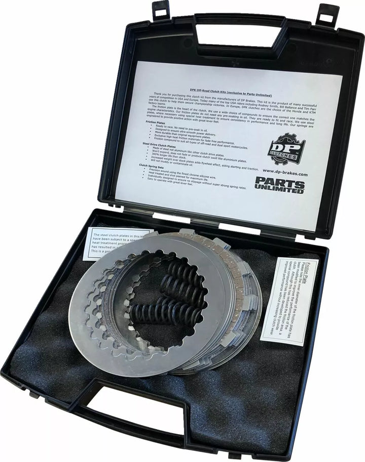 Designed to outperform any oem or aftermarket clutch, DPK kits included friction plates, steel drive plates and clutch springs, except When oem clutch includes reusable diaphragm spring, dpk clutch clutch kits in a foam-line tlast To installation, case can be used to store and transport parts, tools or other items after clutch is installed, come ready to race-no need to presoak plates in oil, designed to Ensure Ultrasmooth Power Delivery, Exclusive High-Heat Materials SUIT OFF-Road and Dual-Sport Bikes, More Durable Than Oem Plates, Steel Drive Plates, Steel Plates Won't Expand, Do Not Fade Or Promote Clutch Swell Like Stock Aluminum Plates, Long Lasting-Up to 300% More Life Life Thanks Plates for aiding starting and traction, will not muddy or contate oil, clutch springs, precision-wound using the finest chrome silicone wire, heat-Treated i upucan za maksimalan život, pojedinac dizajniran da osigura ne drotaciju s proljetnim cijenama od jakih proljeća,