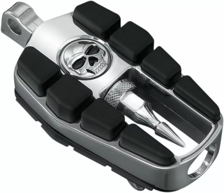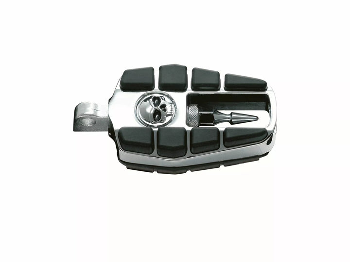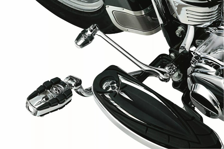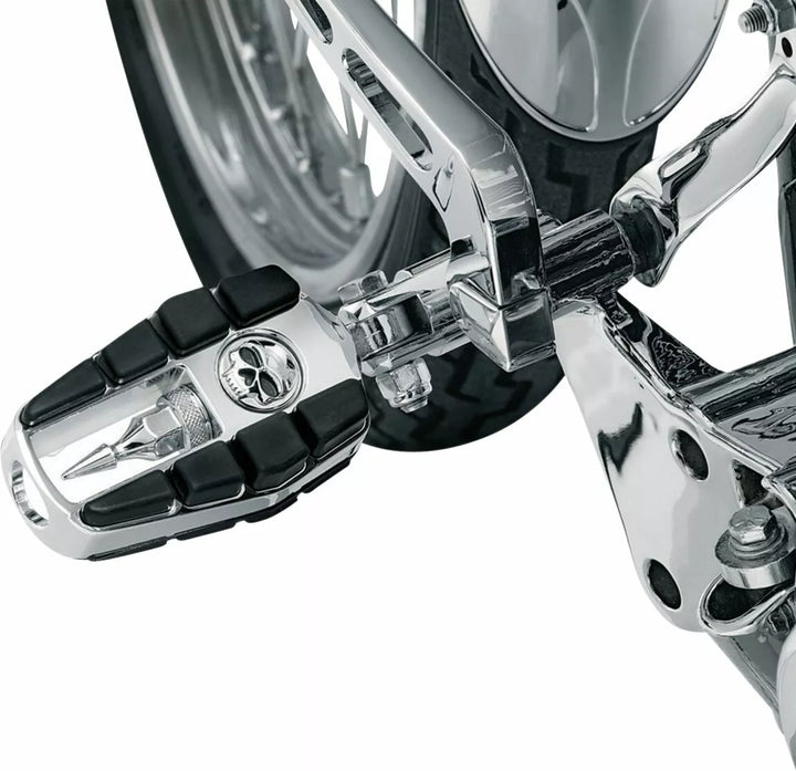 Sadržite zloslutnu kromiranu točku spirale i smještene između gumenih jastučića, kromiranih tijela s gumenim jastučićima, čvrstim, robusnim dizajnom klipova, nogometnim krajevima zahtijevaju nosači nosača za nogu ili adapteri za nogavice za nogavice ili adapteri Kuryakyn