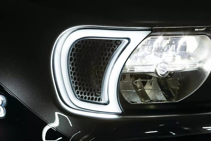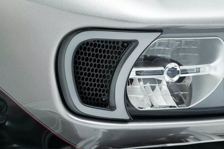 Ovaj ultra-trick dizajn pruža maksimalni L.E.D. Površina i izlaz, s elegantnim omotanim polikarbonatnim objektivom i ABS roštilj za protok otvorenog zraka, dvofunkcionalni prekidač Bijela svjetla za trčanje s jantarskim signalima za okretanje, utikač i igranje