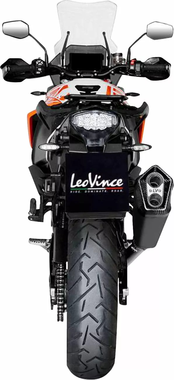 AISI 304 Nerūsējošais tērauds, melna keramikas balstīta glezna, pilna oglekļa gala vāciņš ar matētu skaidru pārklājumu, dubultā plūsmas trokšņa slāpētājs, TIG metinājumi, lāzera eketis "Leovince" logotips, lāzera griezums braket, der ar sliedēm oriģinālam un givi panneram