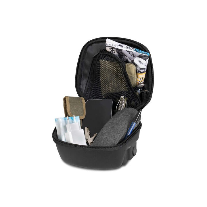 Tā iekšpusē ir acs nodalījums, kas tiek atvērts ar rāvējslēdzēju un ļauj glabāt preces. Tam ir rāvējslēdzēji, kas piemēroti lietošanai ar cimdiem un bloķēšanai ar piekaramo atslēgu. Galvenajam nodalījumam ir tīkls, lai samazinātu satura kustību. Tam ir nēsāšanas rokturis, plecu siksna un atstarojoši elementi, lai palielinātu tā redzamību citiem transportlīdzekļiem.