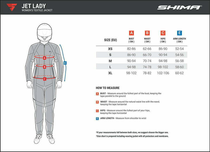 Shima Jet Lady ir vasaras jaka sievietēm, kas izgatavotas no elpojoša acu auduma, kas paredzēta braukšanas amatieriem, kā arī sievietes, kurām patīk tuvumā esošie braucieni. Pateicoties lielajiem ventilācijas paneļiem, tas nodrošina lielu gaisa plūsmu, kas garantē maksimālo ventilāciju pat karstākajās dienās. Šim modelim ir noņemama ūdensnecaurlaidīga NextDry ™ membrāna lietošanai iekštelpās vai ārpus telpām.