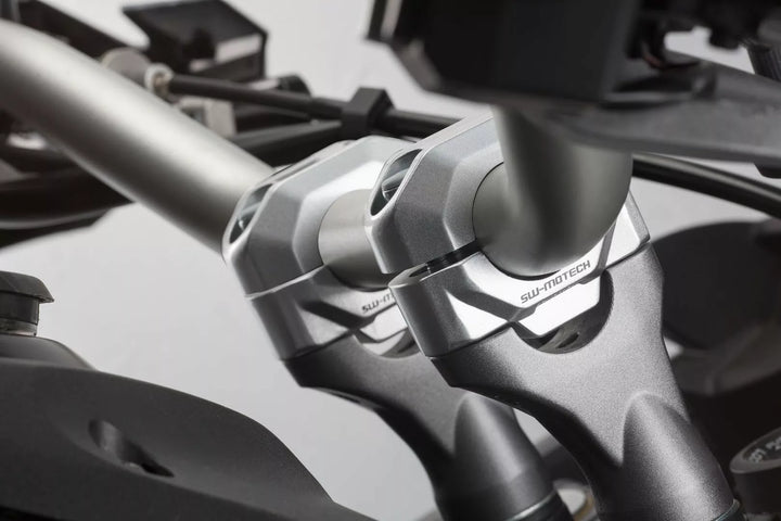 Lai iegūtu mierīgāku sēdēšanas stāvokli, aizstāj oriģinālo apstrādājamo skavu, Ø 22 mm stūri ar urbuma atstarpi 32-38 mm, kas iekļauts piegādē, 2 x stieņa stāvvads Ø 22 mm stūres stūre, 2 x stūves skavas, montāžas instrukcijas, mīļu materiāla materiālu