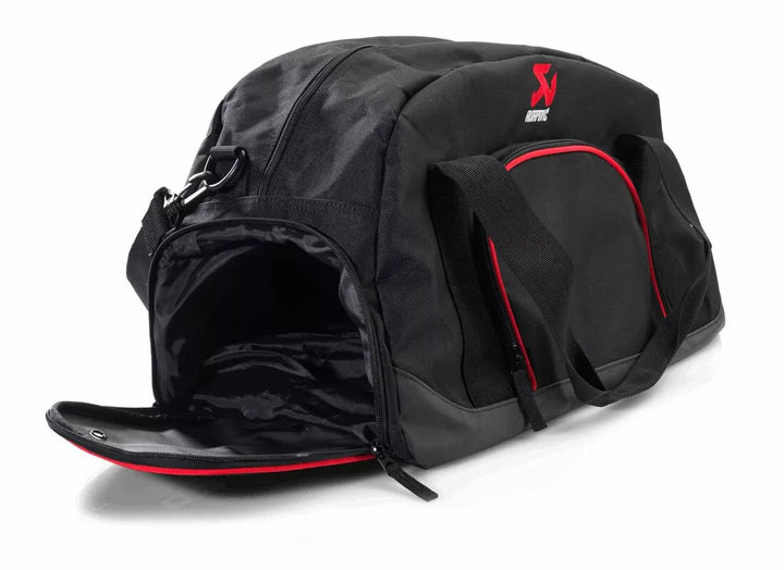 Made in Collaboration with the Renowned Ogio Brand and Constructed Using Durable and Long-loading Materials., The Dome Shape Can Accommodate SHOES IN A SPECIAL VALVE COMPARTMENT, features a Front Zippered Pocket, Padded Shoulder Strap, All-Mal- Black With Red Detailing and A Discreet Akrapovic Logo., 30 × 60 × 63 cm