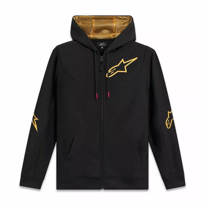 Hooded Zip Front Poly Fleece. , Zip Front Hoodie with Alpinestars DNA Styling., Mesh Lined Hood, Tech Drawcords, Rib Cuffs and Hem., Large Chest Logo, Elbow Logos, Forearm Astars Word and Back Wordmark Prints., Internal Main Label and external Label Branding.