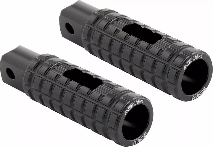Speedliner Footpegs Feature an Oversized 3D Knurled Billet Design, Each Peg is CNC Machined From Billet Aluminum, Center Cut Out Pocket Adds Style & Added Foot Traction, Reduced Length for Increased Ground Out Clearance. Foot Controls, Grips & More Are Also Available, Laser Engraved Arlen Ness ᆴ Logo, For Standard Male Mount and M8 Softail ᆴ Driver/Passenger