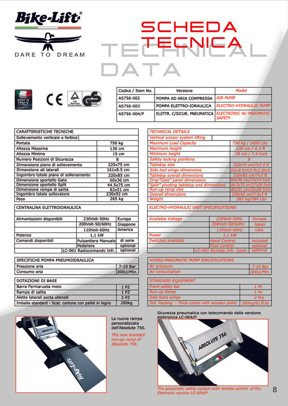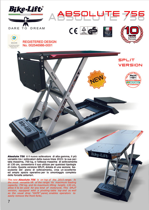 Note: The CE Declaration of Conformity Can Be Found Alongside The User Manual Within The Product Itself. The Lift Table Absolute 756 Split is specially designed for Heavier Bikes. Capable of lift up to 750 kg at a height of 1.30 meters, it is equipped with a front & rear sliding trap gate that Provide Easy Access to the Wheel for Easy Operation. With a Steel Structure Extremely Strong and Stable, It Offers Working Comfort Increased Work Safely. Technical details : Mechanism: Electro-hydraulic (By remote control)Input current: 230V / 50HzMaximum capacity: 750KgMaximum height: 130cmMinimum height: 19cmSafety locking: 8Rear sliding trap gateTabletop dimensions: 220 x 75cmGutters Dimensions: 220 x 8.5cmrun-up Ramp Dimensions: 82 x 51cmrear Sliding Gate Dimensions: 60 x 36cmssplit Pivoting Tabletop Dimensions: 44.5 x 75cmoverral Dimensions: 230 x 92cmweight: 260kg Standard Equipment: Central Run-Center Run-upment bardelivered in woodbox