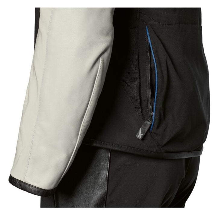 The jacket construction combines elastic outer fabric with recessed leather sections in the form of ergonomic folds and flex zones, which provides optimal freedom of movement without compromising safety. The accompanying Gore-Tex® outer jacket (Waterproofness 10,000 mm) is completely wind and waterproof, but at the same time very breathable and can easily be compacted compact when the weather clears.