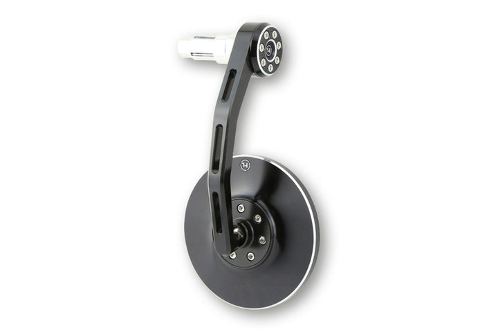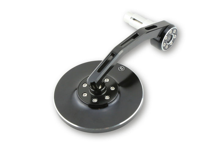 This Highsider handle mirror is CNC-processed and has a rounded head in black anodized aluminum. Together with the polished faces, this model stands for a Nobel and stylish design. The mirror fits the handlebars with an interior dimensions of 12 to 22 mm, which means that it fits on most 7/8 inches and 1 inch aluminum or steel pipe board. The mirror is equipped with a lightly tinted, curved glass for the best possible visibility.