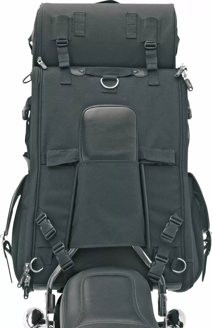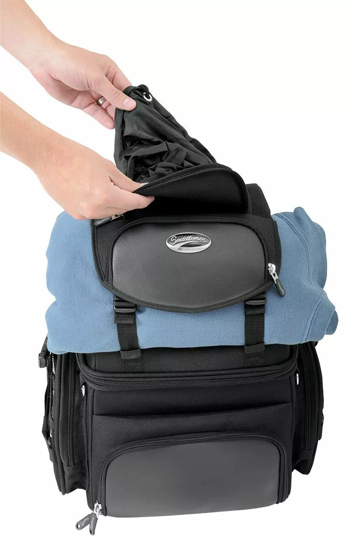 Two Mounting Systems Included: Saddlemen's "Versa-Mount" under-seat Yoke and Harness, and an Adjustable Sissy Bar Strap System that Easily Attaches Bag to Your Motorcycle's Seat, Luggage Rack or Sissy Bar, Backrest Pad Can be Adjusted Detachable Backpack Straps for Easy Off-the-Bike Jaunts, Include Another Large Top-Loading Main Compartment with Internal Organizer Pocket, Five External Pockets, Two of Which Can Be Expanded for Added Capacity, Five Internal and Two Outer Mesh Pockets The Elements, Top Exterior Flap Can Be Adjusted to Carry A Jacket, Mini-Padlock, With Extra Keys, Helps Secure Your Belongings In The Bag, Internal Structure Maints Bag Shape and Is Strong Enough to Lean On, Even When WEPS 11 " Inches Cargo Capacity; Holds One 3/4 Helmet Plus Other Cargo, No Sissy Bar Required, EU Measurements 27.94 cm Width x 38.10 cm Height x 25.40 cm Depth.
