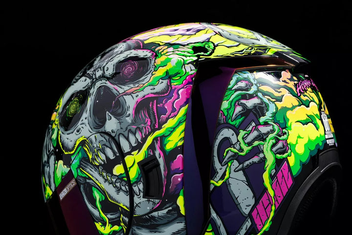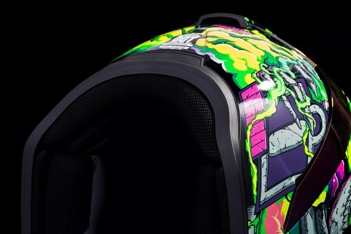 Polykarbonát shell s injekčným obsahom pre pevnosť a trvanlivosť, stredný tvar hlavy, čistá hmla Optics ™ nainštalovaná, Purpurová RST FAG FAG FAG FAG, v zahrnutí tmavého dymového zamyka Shield je s rýchlym uvoľňovaním úplne zatvorenej polohy, odnímateľným lisovaným deflektorom dychu, prácou vrecka vnútorného reproduktora s R.A.U. Bluetooth