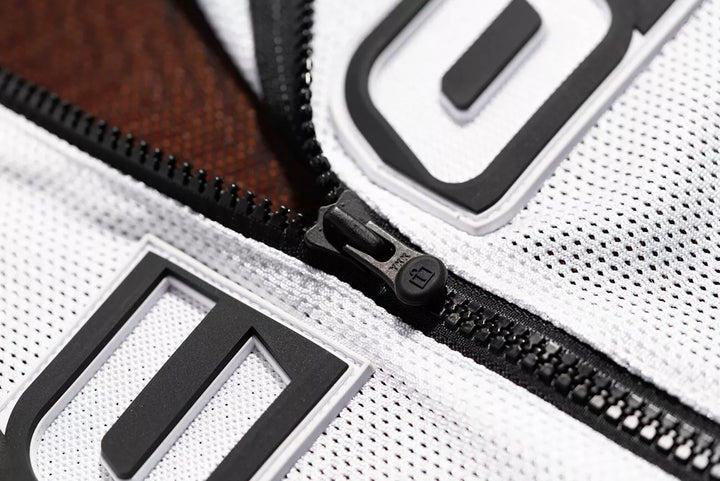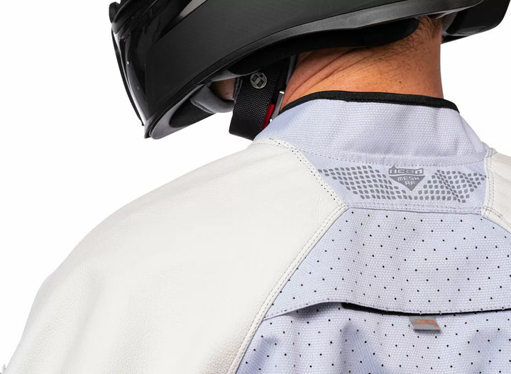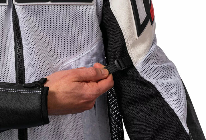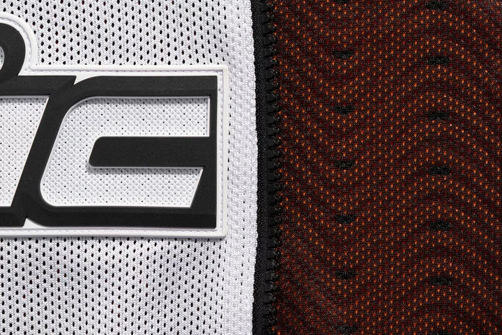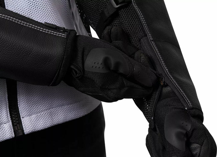 Odolný 300D polyester a železo Weave ™ Sieťový podvozok, 1,2 mm-1,4 mm TRACSpec ™ Leather v primárnej zóne zrážky, nastaviteľný pás a remienok na rameno, ICON® Sport FIT, YKK® Zippers, Back Protector EN 1621-2 úroveň 1, EN170-70-2-2